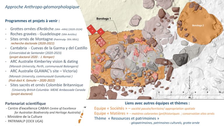 - Anthropo-géomorphologie, partenariat Ministère de la Culture. Liens Australie (projets ARC Kimberley et Victoria), centre d’excellence CABAH for Australian biodviersity and Heritage. Collaboration avec University of British Columbia (Canada) sur les sites ornés de BC.