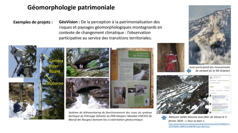 - Géomorphologie patrimoniale : partenariat avec les parcs naturels et collectivités locales.