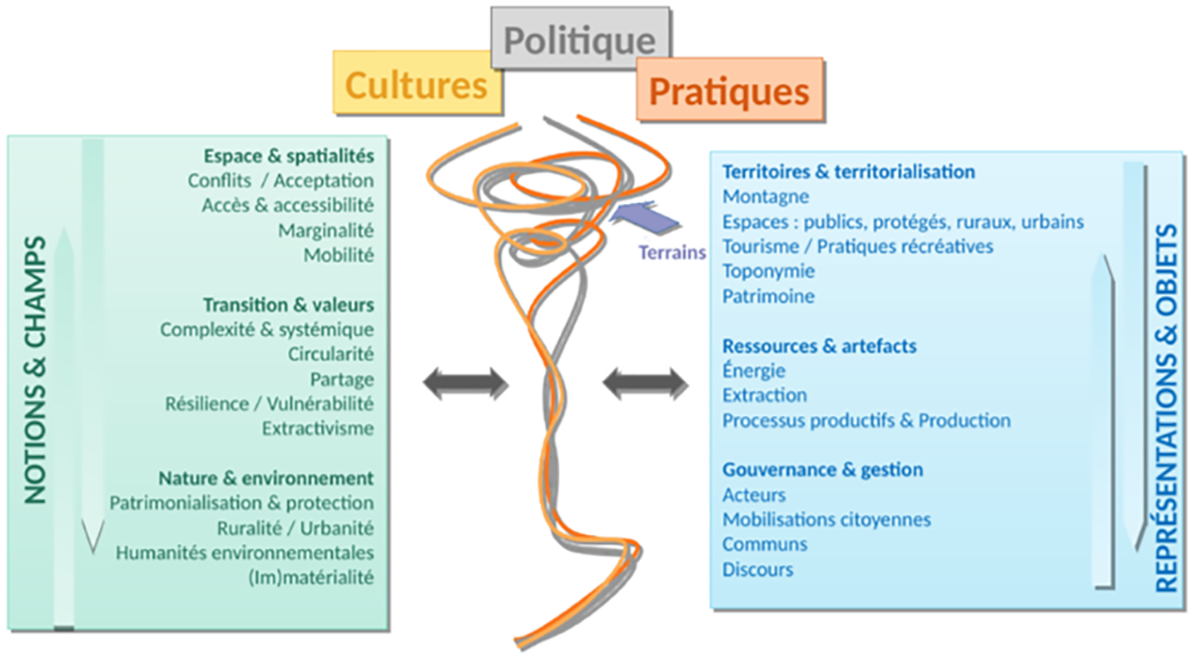 Les travaux conduits au sein de l’équipe s’appuient sur les pratiques et sur les discours pour éclairer les notions de ressources, de cultures, de valeurs et de conflits qui permettent de mieux comprendre l’organisation de l’espace des sociétés et les enjeux associés.