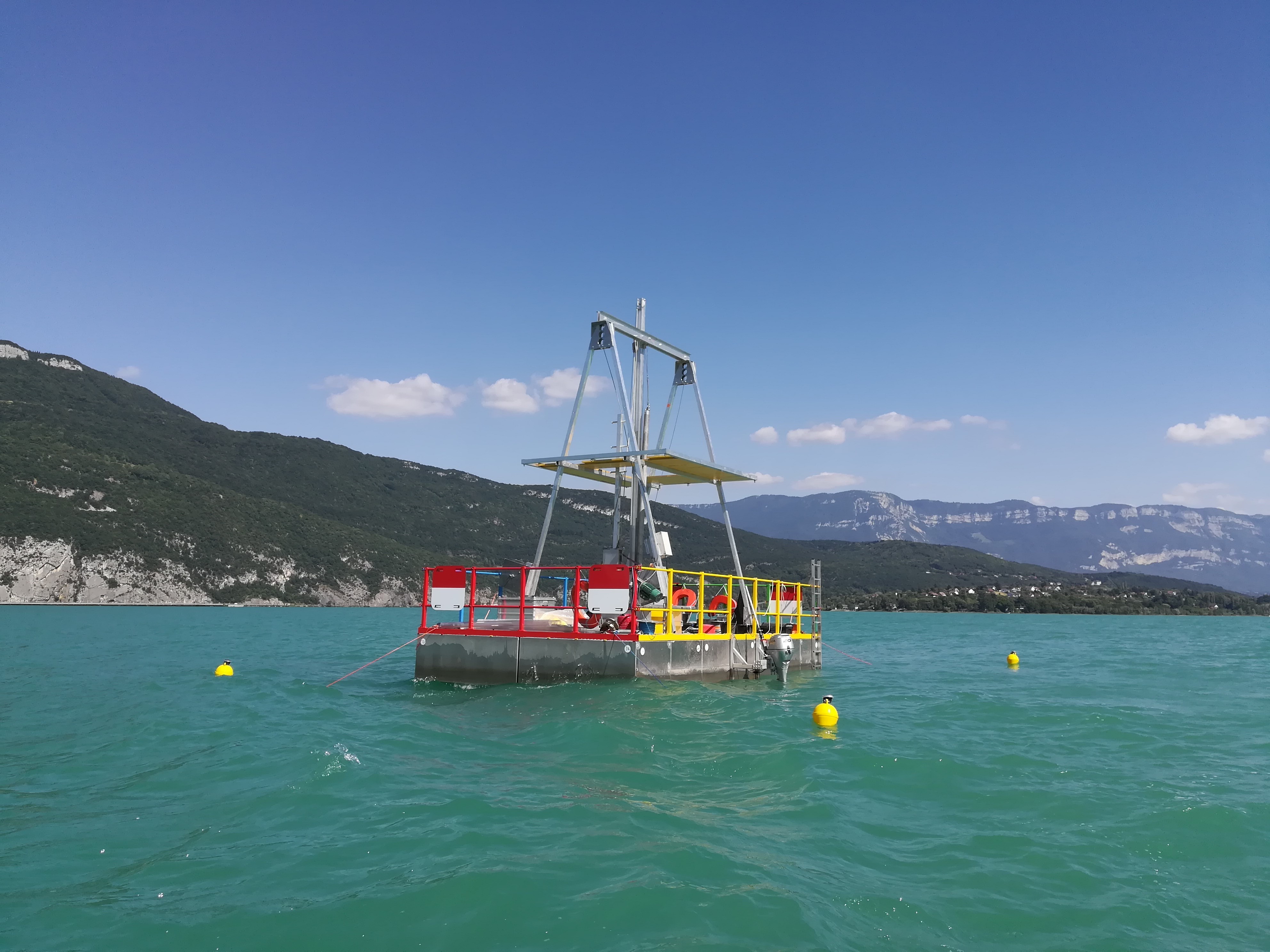 Cela est particulièrement crucial dans les zones montagneuses, où les taux d’érosion les plus élevés sont enregistrés. Le bassin versant du lac du Bourget, l’un des plus grands des Alpes européennes, est utilisé dans cette étude pour estimer quantitativement l’impact des activités humaines sur l’érosion. Sur la base de l’étude d’une carotte de sédiment de lac (prélevée grâce à la plateforme de carottage visible en Fig. 2), et en utilisant la géochimie isotopique via une approche « source-puits », il est établi que les effets des activités humaines sur l’érosion l’emportent sur ceux du climat depuis plus de 3800 ans.