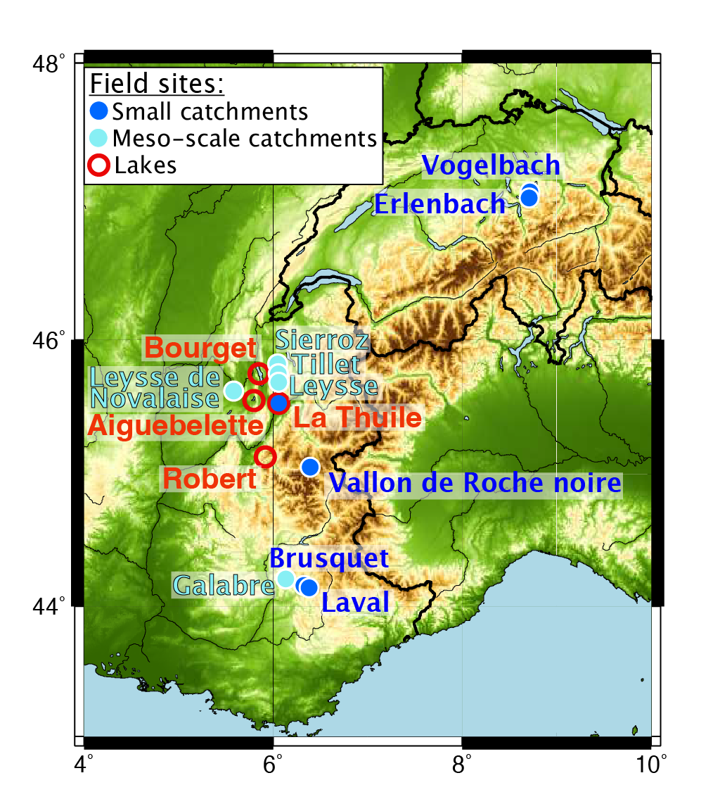 We will also study several small Alpine catchments Laval (1.1 km2) and Brusquet (0.9 km2) rivers from the CZO “Draix-Bleone” (observed since 1983), part of the OZCAR network ; Erlenbach (0.7 km2) and Vogelbach (1.6 km2) rivers, from the upper Alptal valley, Vallon de Roche Noire (3.5 km2) from the site Lautaret Roche Noire and the catchments from Lake La Thuile and Lake Robert.