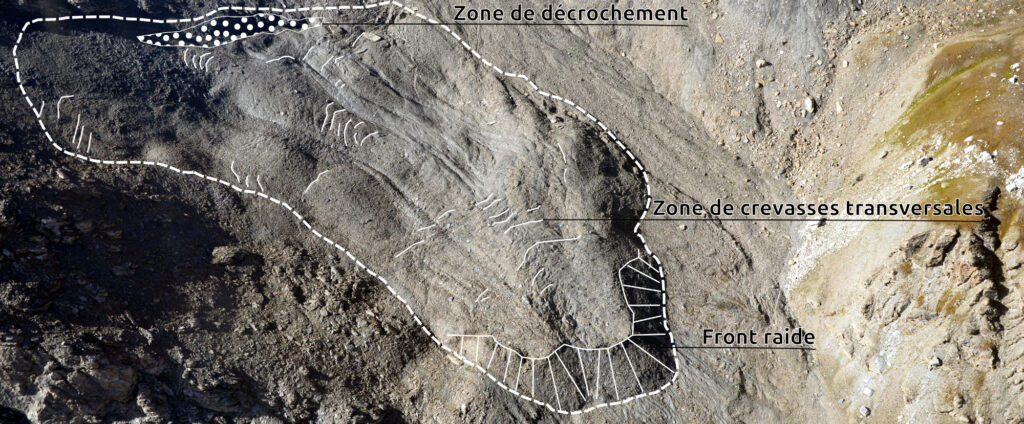 Les glaciers rocheux sont des masses de débris gelés, indicatrices de la présence d’un permafrost riche en glace et s’écoulant lentement, de façon visco-plastique, sur les versants de montagne. Très courants dans les paysages alpins, les glaciers rocheux connaissent depuis quelques décennies une évolution nettement différente de celle qui a permis leur mise en place au cours des milliers d’années antérieures. Outre une accélération de leur écoulement, observée de façon très homogène sur la plupart des glaciers rocheux connus du globe, certaines formes sont affectées d’une déstabilisation dont les manifestations géomorphologiques peuvent être préoccupantes en termes de risques associés. Outre des vitesses de surface d’un ou deux ordres de grandeur plus élevées, ce comportement anormal est caractérisé par l’apparition de mécanismes de rupture et de glissement, traduits par des crevasses et des arrachements, pouvant évoluer vers un effondrement d’une partie du glacier rocheux.