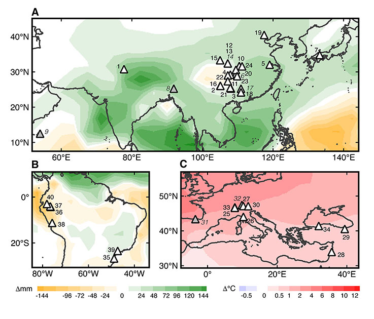 Ce travail de recherche a rassemblé 63 jeux de données climatiques provenant de stalagmites collectées en Europe, Asie et Amérique du Sud et représentant plus de 20 ans de recherches publiées par des équipes scientifiques du monde entier (Figure ci-contre).