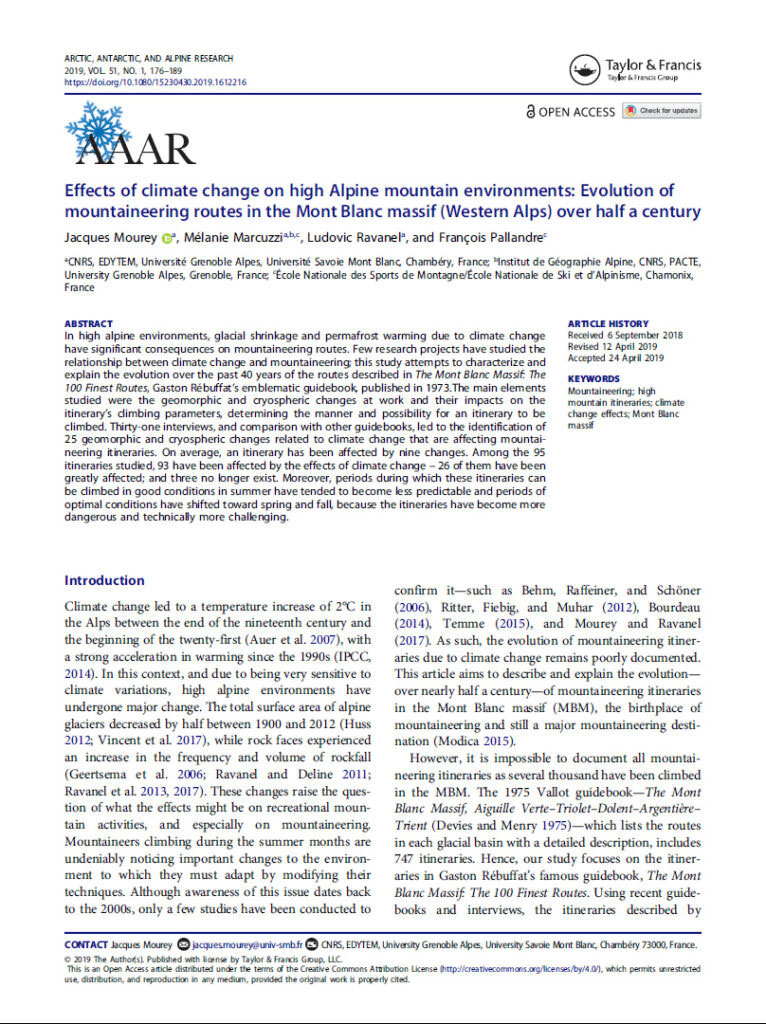 Le nouveau lauréat est Jacques Mourey pour son article “Effects of climate change on high Alpine mountain environments : Evolution of mountaineering routes in the Mont Blanc massif (Western Alps) over half a century” co-rédigé par Mélanie Marcuzzi, Ludovic Ravanel & François Pallandre (DOI : 10.1080/15230430.2019.1612216).